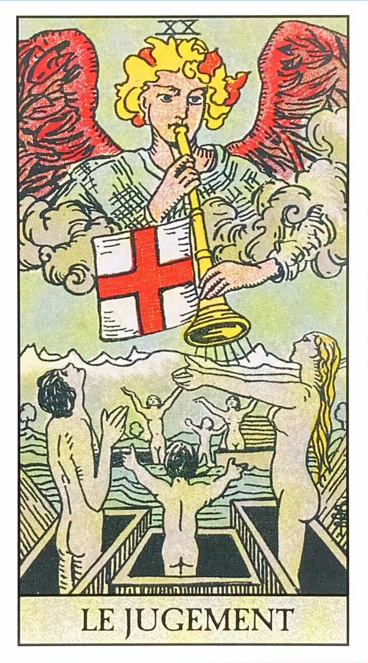 Dans le Tarot Rider Waite, l’ange est l’archange Gabriel, planant dans un ciel de nuées grises, soufflant dans une trompette ornée d’un étendard blanc à croix rouge. En contrebas, des hommes, femmes et enfants nus s’élèvent de tombes grises, les bras levés vers la lumière. Des montagnes et une mer en arrière-plan évoquent la traversée d’un seuil ou la fin d’un cycle. La scène rayonne d’une énergie claire, triomphante, marquant un moment d’illumination et de révélation.