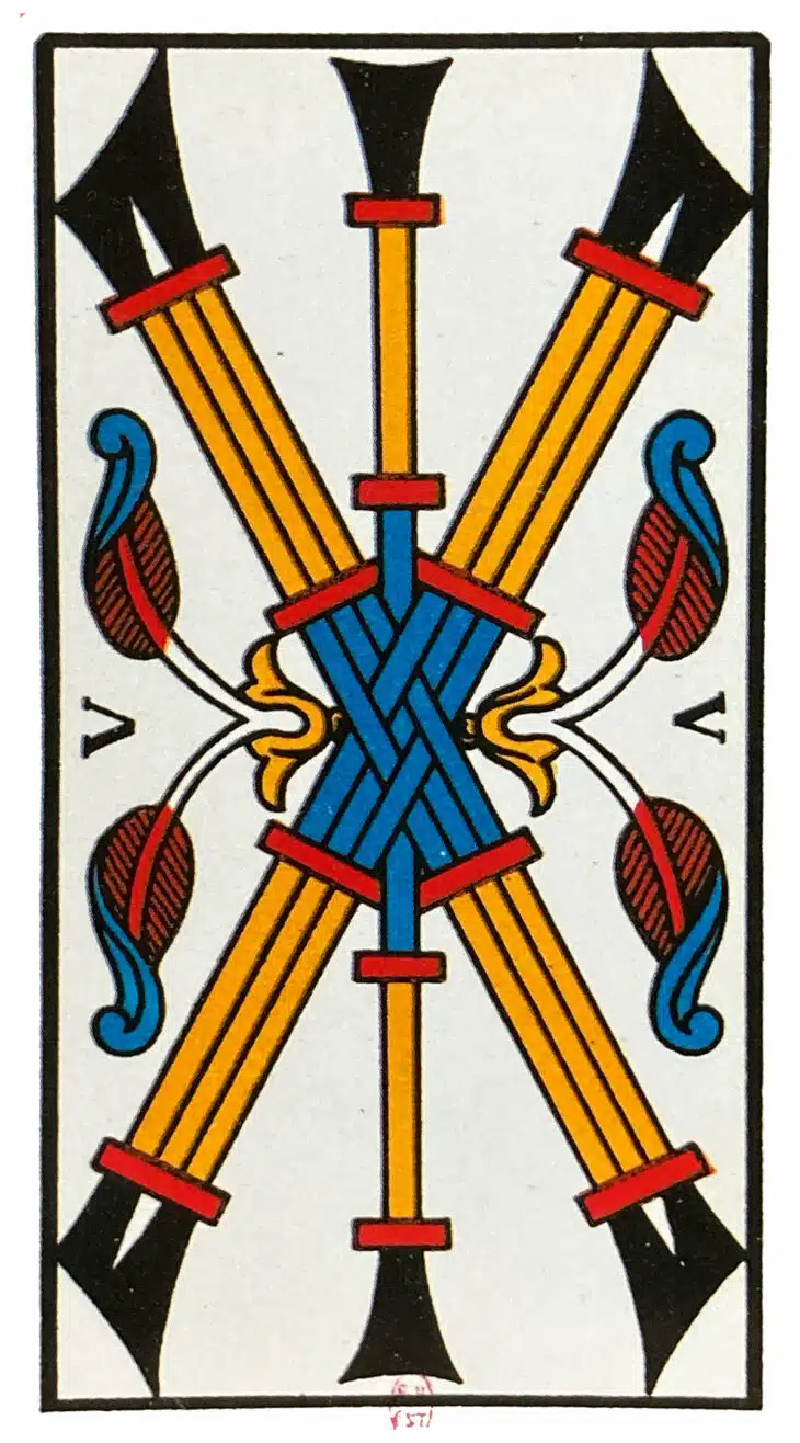 Dans le Tarot de Marseille, le Cinq de Bâtons présente cinq bâtons entrecroisés, en forme de croix avec le cinquième bâtons central vertical, noués au centre par un motif floral. L’ensemble semble moins fluide que dans les arcanes précédents, traduisant une tension ou une résistance dans la structure. Les éléments décoratifs sont denses, comme pour signifier un désordre contenu ou une phase de complexité.